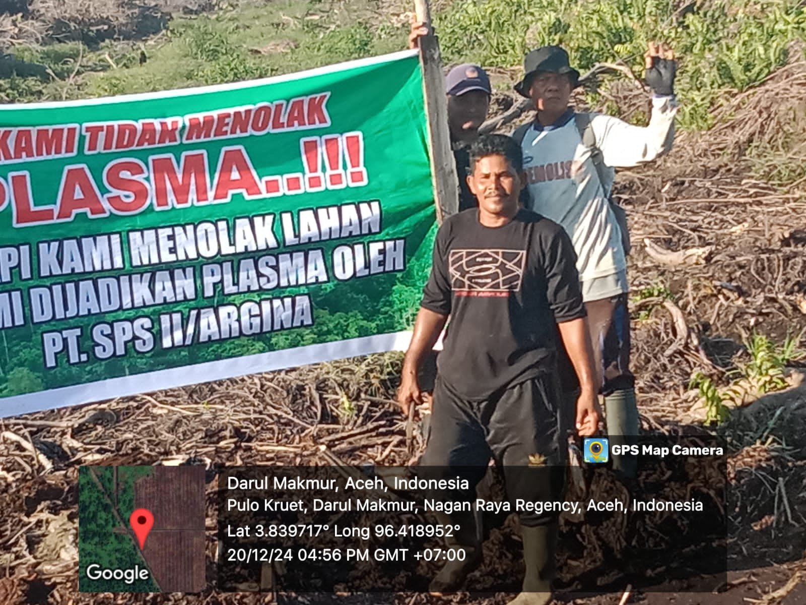 Dalam aksi protes ini, puluhan warga masyarakat Babah Leung menolak tanah pribadi mereka garap sejak 2010, 2012, 2014, 2016, 2017,2019 2020 dan 2022 seluas keseluruhan mencapai 250 Hektar dibangun kebun plasma PT SPS II/ PT ARGINA, kata Safari IS Ketua Kelompok Tani Masyarakat Babah Leung.“Lahan perkebunan ini ada sebagian dikerjakan cara kami garap sendiri dan ada juga kami peroleh cara jual beli tanah alas hak atas tanah keluarkan Pemerintah Gampong,” ujar Safari IS.