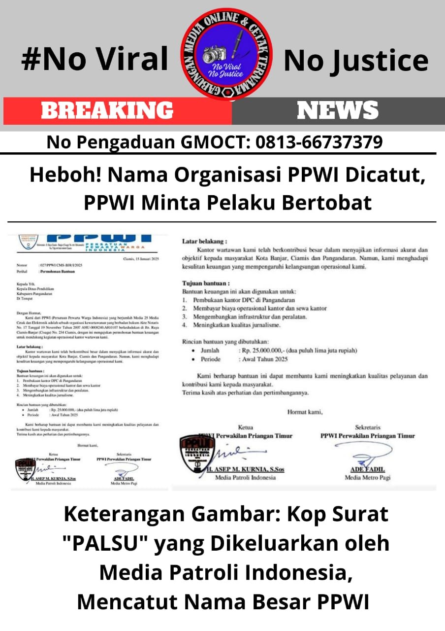 Bongkar Perkara.Com Jakarta – Hari ini, Kamis, 16 Januari 2025, beredar luas sebuah surat menggunakan Kop Surat PPWI palsu, mengatasnamakan organisasi Persatuan Pewarta Warga Indonesia (PPWI), yang ditujukan kepada Kepala Dinas Pendidikan Kabupaten Pangandaran, tertarikh 15 Januari 2025. Surat tersebut pada intinya meminta bantuan dana sebesar Rp. 25.000.000,- (dua puluh lima juta rupiah) kepada Kepala Dinas Pendidikan Kabupaten Pangandaran. Dalam surat itu, tertulis pembuat dan/atau pengirim surat adalah Ketua PPWI Perwakilan Priangan Timur, H. Asep M. Kurnia, S.Sos dari media Patroli Indonesia, dan Sekretaris PPWI Perwakilan Priangan Timur, Ade Fadil dari media Metro Pagi.