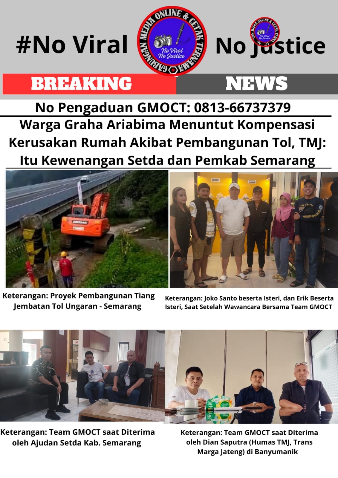 Bongkar Perkara.Com Ungaran, Jawa Tengah – Warga Perumahan Graha Ariabima, Susukan, Ungaran Timur, Kabupaten Semarang, terus memperjuangkan haknya atas kerusakan rumah mereka akibat pengerjaan penguatan tiang jembatan Tol Ungaran-Semarang. Setelah setahun menantikan kompensasi dari PT Trans Marga Jateng (TMJ), warga akhirnya meminta bantuan Gabungan Media Online dan Cetak Ternama (GMOCT) untuk menyuarakan aspirasinya.