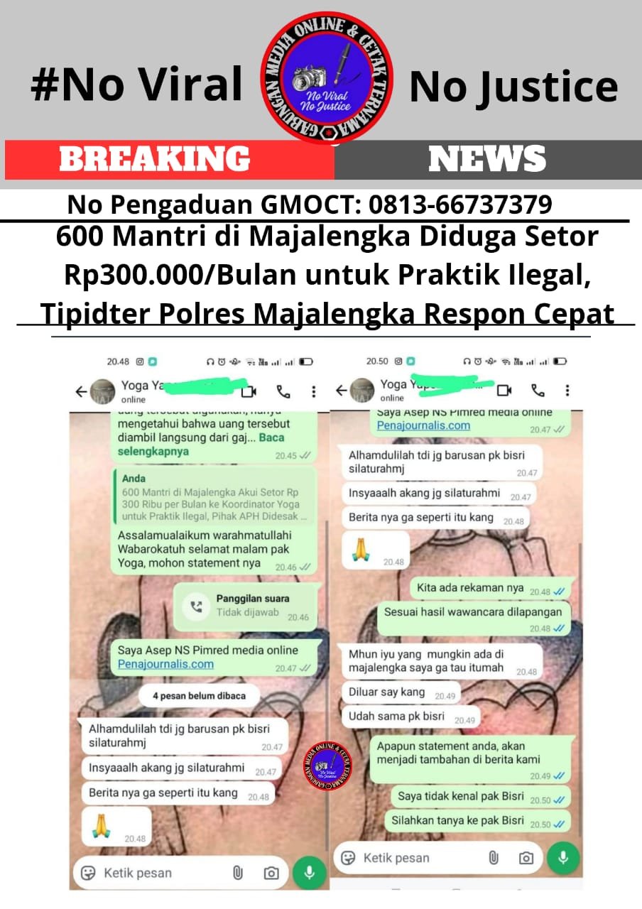 Bongkar perkara.com Majalengka, Jawa Barat – 5 Februari 2025 – Kasus dugaan praktik layanan kesehatan ilegal yang melibatkan sekitar 600 mantri di Kabupaten Majalengka, Jawa Barat, terus bergulir. Para mantri tersebut mengaku menyetor uang sebesar Rp300.000 per bulan kepada seorang koordinator bernama Yoga Yaperni, yang diduga sebagai imbalan agar mereka dapat menjalankan praktik tanpa izin resmi. Informasi ini awalnya diungkap oleh N, seorang mantri di Palasah, kepada tim investigasi, dan kini telah dilaporkan ke pihak berwajib oleh GMOCT (Gabungan Media Online dan Cetak Ternama).