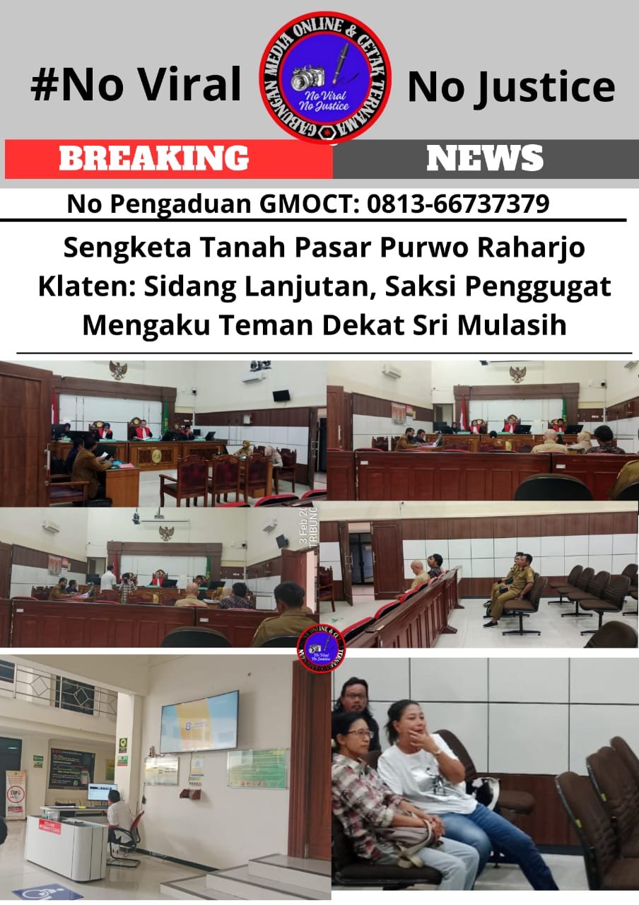 Bongkar perkara.com Klaten, 3 Februari 2025 – Sidang lanjutan sengketa tanah Pasar Purwo Raharjo, Desa Teloyo, Klaten, yang digelar hari ini, Senin (3/2/2025), menghadirkan saksi dari pihak penggugat, Sri Mulasih. Sidang yang dijadwalkan pukul 13.00 WIB, baru dimulai pukul 14.15 WIB. Agenda sidang kali ini adalah mendengarkan keterangan saksi dari pihak penggugat dan tergugat.