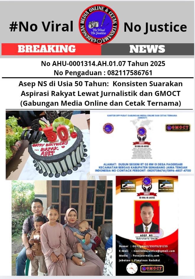 Bongkar Perkara.Com Kabupaten. Semarang 26 Maret 2025 – Asep Saefulloh, atau Asep NS, merayakan ulang tahun ke-50 pada 25 Maret 2025. Di usia setengah abad ini, Direktur PT PENAJOURNALIS LINTANG MEDIA dan Pimpinan Redaksi Penajournalis.com ini menegaskan komitmennya untuk terus mengabdikan diri bagi masyarakat Indonesia melalui pemberitaan yang berpihak pada keadilan dan kebenaran. Komitmen ini diwujudkan melalui dua media online yang dipimpinnya, Penajournalis.com dan Lintangpena.com, serta didukung oleh puluhan media online dan cetak yang tergabung dalam GMOCT (Gabungan Media Online dan Cetak Ternama).