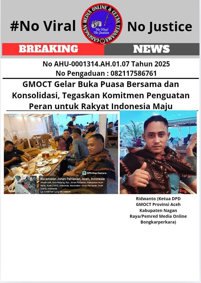 Ridwanto, Ketua DPD Provinsi Aceh GMOCT, menekankan pentingnya kebersamaan dan sinergi antar jurnalis dalam merespon keluhan masyarakat, khususnya menjelang Hari Raya Idulfitri 1 Syawal 1446 H. Ia mengajak seluruh anggota untuk lebih aktif menerima dan menindaklanjuti pengaduan masyarakat terkait dugaan pelanggaran hak-hak warga negara.