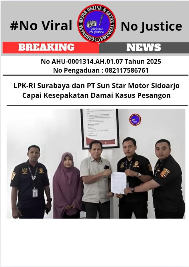 Sidoarjo, Jawa Timur – Bongkarperkara.com-Lembaga Perlindungan Konsumen Republik Indonesia (LPK-RI) DPC Kota Surabaya berhasil memediasi kasus pesangon karyawan PT Sun Star Motor Cabang Sidoarjo. Mediasi kedua yang berlangsung di kantor PT Sun Star Motor Sidoarjo pada pukul 10.00 WIB, Rabu, [Tambahkan Tanggal], menghasilkan kesepakatan damai antara kedua belah pihak. Informasi ini diperoleh GMOCT (Gabungan Media Online dan Cetak Ternama) dari media online KabarSBI yang tergabung dalam GMOCT.