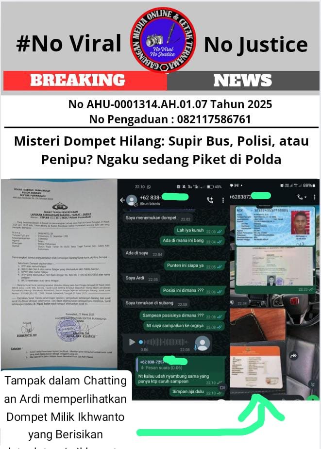 Bongkar perkara.com Purwadadi, 28 Maret 2025 (GMOCT) – Kasus kehilangan dompet yang dialami Ikhwanto pada Minggu, 23 Maret 2025 lalu, berbuntut panjang dan menimbulkan tanda tanya besar. Kehilangan dompet berisi KTP, SIM A dan C, NPWP, BPJS, ATM, dan STNK (dalam proses) tersebut berujung pada sebuah kisah yang melibatkan seorang supir bus bernama Ardi, dan menimbulkan dugaan penipuan.