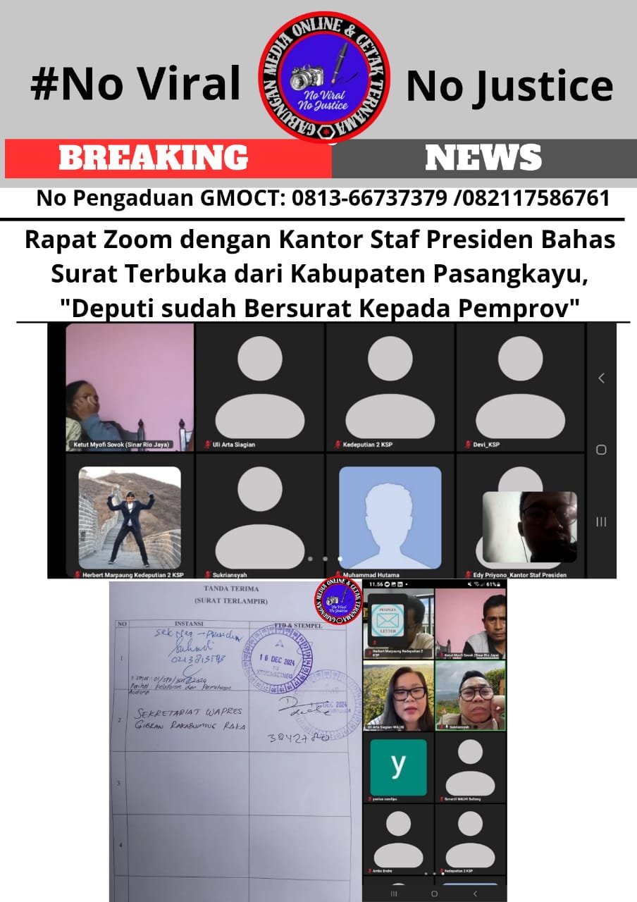 Bongkar Perkara.Com Pasangkayu, Sulawesi Barat – Perwakilan masyarakat dari Serikat Petani Pasangkayu, Sulawesi Barat, menggelar rapat virtual dengan Kantor Staf Presiden (KSP) pada 21 Januari 2025. Rapat tersebut membahas surat terbuka masyarakat terkait dugaan praktik mafia tanah dan konflik agraria di Kabupaten Pasangkayu, yang melibatkan beberapa perusahaan perkebunan kelapa sawit, yakni PT Pasangkayu, PT Mamuang, dan PT Letawa. Bung Dedi, inisiator Peoples Letter dan pelapor ke Sekretariat Presiden dan Wakil Presiden, memimpin delegasi masyarakat.