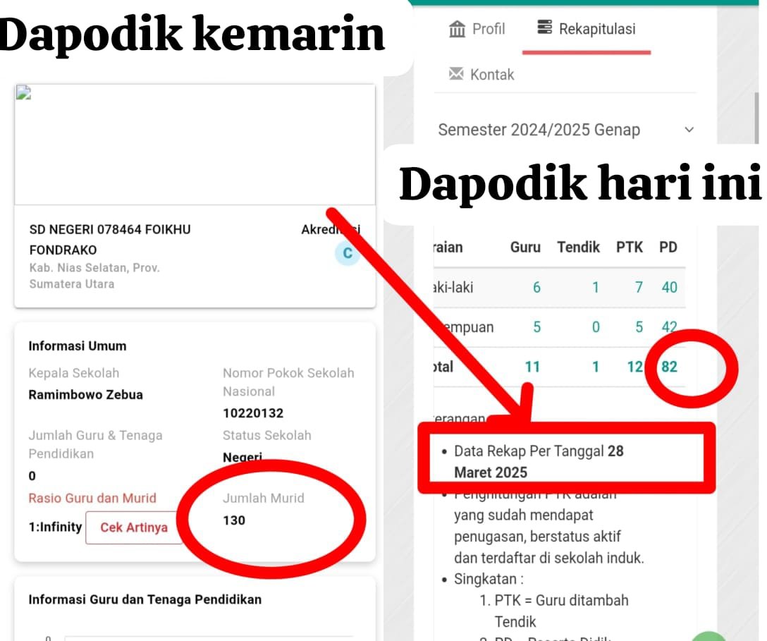 Setelah viral di beberapa media pemberitaan akhir akhir ini, jumlah siswa di data dapodik sekolah SD Negeri 078464 SD foikhu fondako berubah seketika, diberitakan sebelumnya bahwa kepala sekolah bernisial RZ diduga Manipulasi Data Siswa dan guru di sekolah SD yang dipimpinnya selama bertahun tahun. Dari data yang dihimpun sebelumnya yaitu per tanggal 24/3/2025 jumlah siswa di data dapodikman masih tertera sebanyak 130 orang siswa dan jumlah guru Non ASN berjumlah 11 orang, namun setelah beberapa media menyoroti terkait dugaan penggelembungan jumlah siswa dan guru tersebut tersebut pada tanggal 28/3/2025 setelah dilakukan pengecekan oleh tim investigasi LSM LAKI (Laskar Anti Korupsi Indonesia) melalui dashbord dapodikman sekolah tiba tiba berubah menjadi 82 orang siswa dan guru Non ASN menjadi 12 orang.