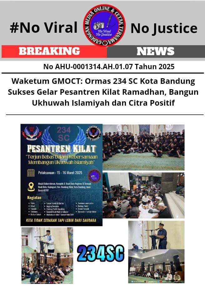 Bongkar Perkara.com Bandung, 16 Maret 2025 – Ormas 234 SC Kota Bandung sukses menggelar Pesantren Kilat (PK) selama dua hari, 15-16 Maret 2025, di Masjid Babburahman, Bandung. Kegiatan bertema “Terjun Bebas dalam Kebersamaan Membangun Ukhuwah Islamiyah” ini diikuti oleh pengurus dan anggota Ormas 234 SC se-Kota Bandung, menandai puncak rangkaian kegiatan Ramadhan mereka yang sebelumnya telah diisi dengan pembagian takjil dan santunan di berbagai wilayah Kota Bandung.