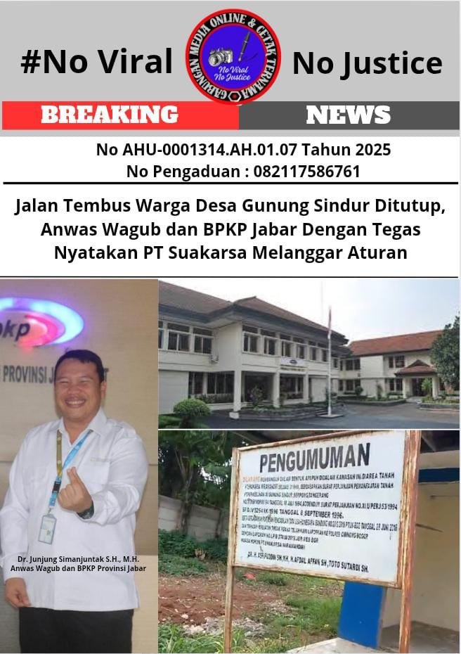 Bongkar perkara.com Gunung Sindur, Jawa Barat – Pemberitaan viral di media online dan cetak anggota GMOCT (Gabungan Media Online dan Cetak Ternama) mengungkap kontroversi penutupan jalan tembus desa di Desa Curug, Kecamatan Gunung Sindur. Jalan yang telah ada sejak zaman Belanda ini ditutup oleh PT Suakarsa Wira Mandiri, pengembang proyek di lokasi tersebut, memicu protes keras dari warga setempat.