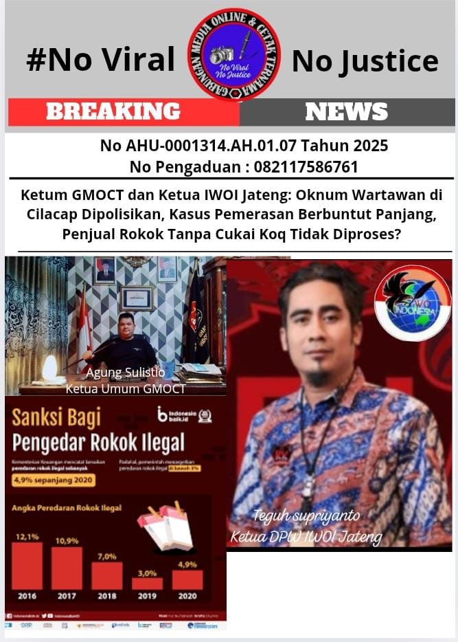 Bongkar Perkara.com Semarang, Jawa Tengah – Kasus penangkapan dua oknum wartawan di Cilacap, Jawa Tengah, atas dugaan pemerasan terhadap pedagang rokok ilegal menimbulkan kontroversi dan pertanyaan besar terkait transparansi penegakan hukum. Teguh Supriyanto, Ketua DPW IWOI Jawa Tengah (Ikatan Wartawan Online Indonesia), menyoroti kejanggalan dalam penanganan kasus ini. Ia mempertanyakan mengapa pedagang rokok ilegal yang telah teridentifikasi justru tidak ditindak, sementara hanya oknum wartawan yang diproses hukum.