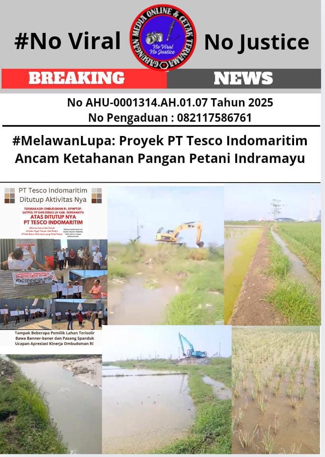 Bongkar Perkara.com Indramayu, 10 April 2025 – Petani Desa Tegal Taman, Kecamatan Sukra, Kabupaten Indramayu, Jawa Barat, kembali menghadapi gagal panen akibat pembangunan proyek PT Tesco Indomaritim. Pembangunan yang memutus tiga saluran irigasi dan tiga akses jalan umum milik desa ini dilakukan tanpa sosialisasi dan sepengetahuan Pemerintah Desa (Pemdes) Tegal Taman, mengakibatkan kerugian besar bagi para petani.