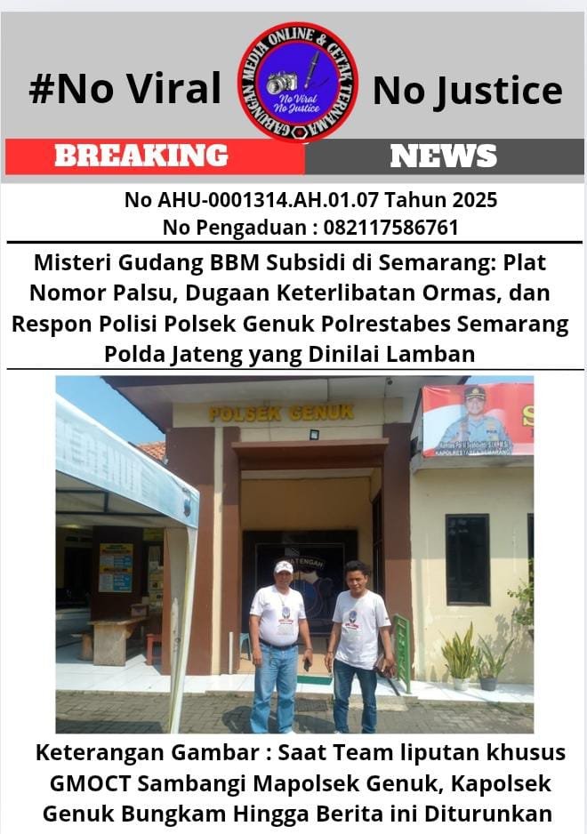 Bongkar perkara.com Semarang, 25 April 2025 – Temuan gudang penimbunan BBM jenis solar bersubsidi di wilayah hukum Polsek Genuk, Semarang, yang telah viral di berbagai media online dan cetak pada 24 April 2025, menimbulkan pertanyaan besar terkait respon pihak berwajib. Tim liputan khusus Gabungan Media Online dan Cetak Ternama (GMOCT) yang menyelidiki kasus ini, mengungkapkan serangkaian kejanggalan dalam proses investigasi.