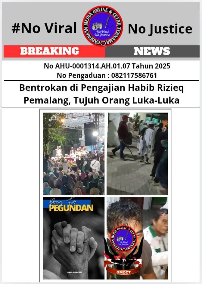Bongkar perkara.com Pemalang, Jawa Tengah (GMOCT) 24 Juli 2025 – Peringatan bulan Muharam yang menghadirkan Habib Muhammad Rizieq Shihab (MRS) di Desa Pegundan, Kecamatan Petarukan, Kabupaten Pemalang, Jawa Tengah, berujung bentrokan pada Rabu (22/7/2025) malam. Insiden ini mengakibatkan tujuh orang luka-luka, termasuk dua anggota kepolisian. Informasi ini diperoleh GMOCT (Gabungan Media Online dan Cetak Ternama) dari Detikperistiwa, media online anggota GMOCT.