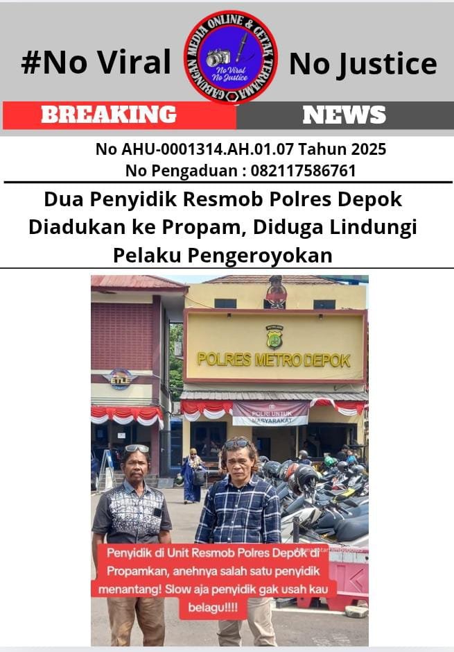 Bongkar perkara.com Jakarta, 18 Juli 2025 (GMOCT) – IPTU Ade Maulana dan Brigadir Hafiz R, S.H., dua penyidik Unit Resmob Polres Metro Depok, dilaporkan ke Seksi Propam Polres Depok atas dugaan pelanggaran etik, keberpihakan, dan ketidakprofesionalan dalam penanganan kasus pengeroyokan. Laporan tersebut diajukan oleh Dr. Manotar Tampubolon, S.H., M.A., M.H., kuasa hukum korban pengeroyokan, terkait laporan polisi LP/B/75/I/2025/SPKT/POLRES METRO DEPOK.