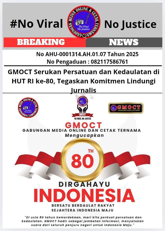 Bongkar perkara.com Kabupaten Semarang (GMOCT) Minggu 17 Agustus 2025 – Gabungan Media Online dan Cetak Ternama (GMOCT) turut merayakan Hari Ulang Tahun (HUT) ke-80 Republik Indonesia dengan semangat persatuan dan kedaulatan. Organisasi ini menegaskan komitmennya untuk menjadi jembatan informasi yang menyatukan suara dari seluruh penjuru negeri demi Indonesia Maju.