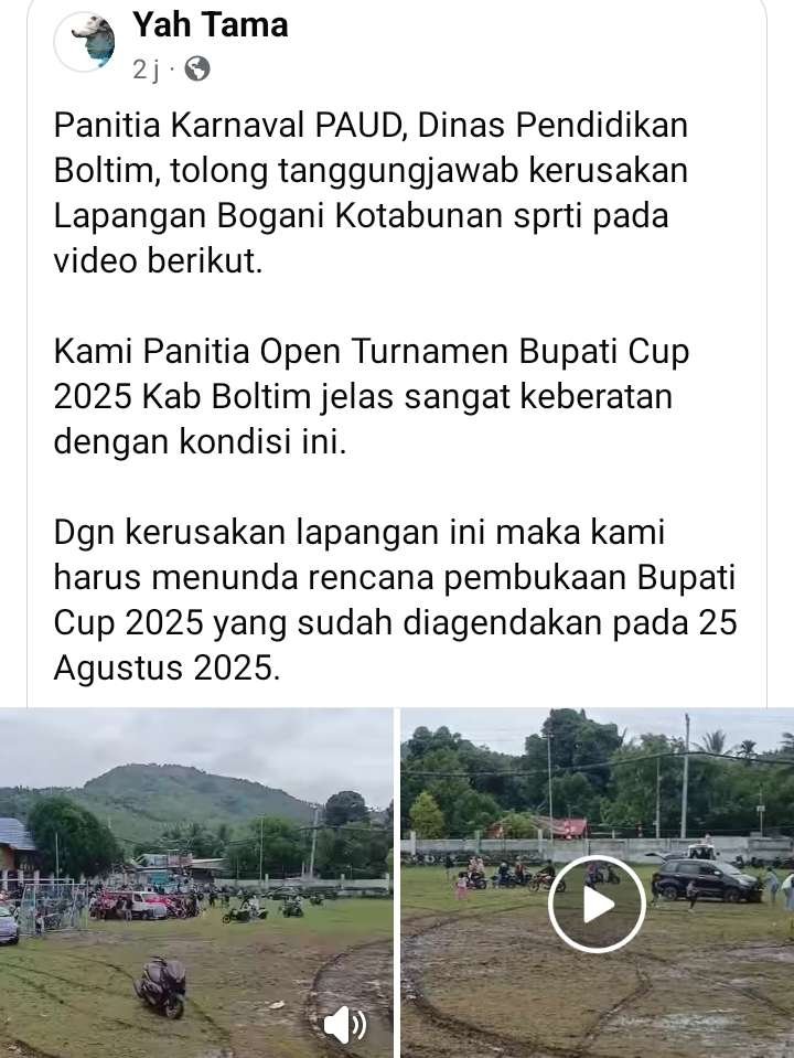 Lapangan Bogani Kotabunan, Kabupaten Bolaang Mongondow Timur (Boltim), mengalami kerusakan usai digunakan pada kegiatan Karnaval PAUD yang digelar oleh Dinas Pendidikan Boltim. Kondisi tersebut memicu protes dari Panitia Open Turnamen Bupati Cup 2025 karena lapangan tidak lagi layak dipakai.