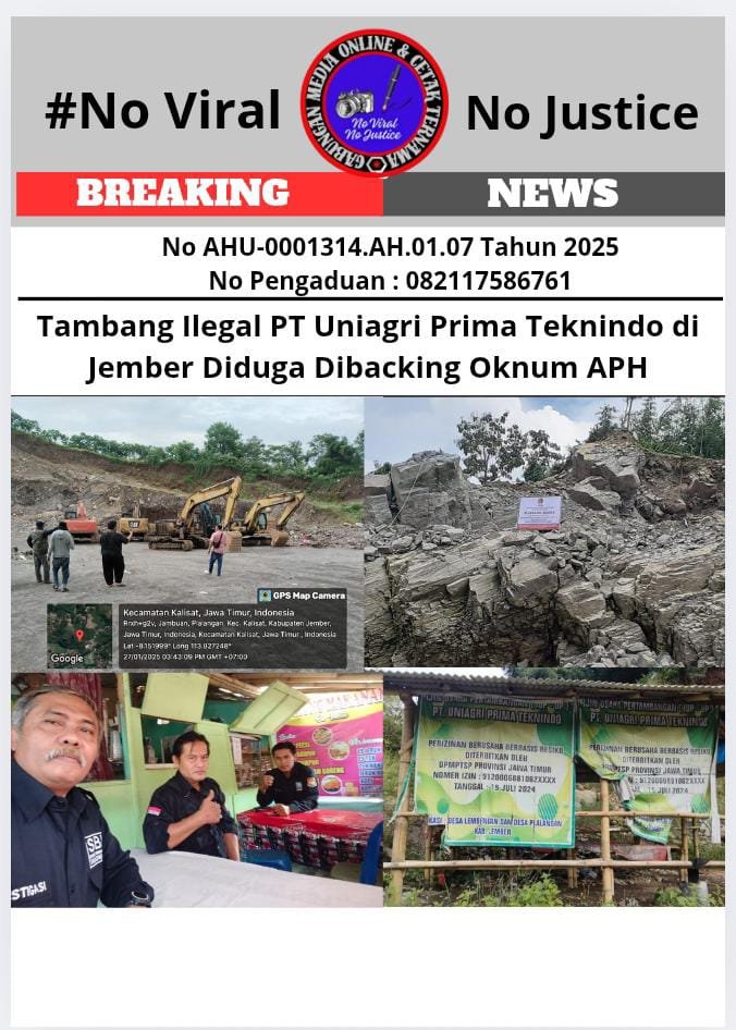 Jember, Jawa Timur (GMOCT) 5 Agustus 2025 – Aktivitas pertambangan galian C di Desa Plalangan, Kecamatan Kalisat, Kabupaten Jember, kembali menjadi sorotan. PT. Uniagri Prima Tekhnindo diduga menjalankan operasi penambangan ilegal tanpa izin resmi, memicu kecurigaan adanya pembiaran bahkan dukungan dari oknum Aparat Penegak Hukum (APH).