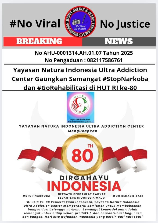 Bongkar perkara.com Jakarta 17 Agustus 2025 (GMOCT) – Yayasan Natura Indonesia Ultra Addiction Center turut memeriahkan Hari Ulang Tahun (HUT) ke-80 Republik Indonesia dengan semangat memerangi narkoba dan mendorong rehabilitasi bagi para pecandu. Melalui berbagai kegiatan dan pernyataan, yayasan ini menegaskan komitmennya untuk membebaskan bangsa dari belenggu narkoba.