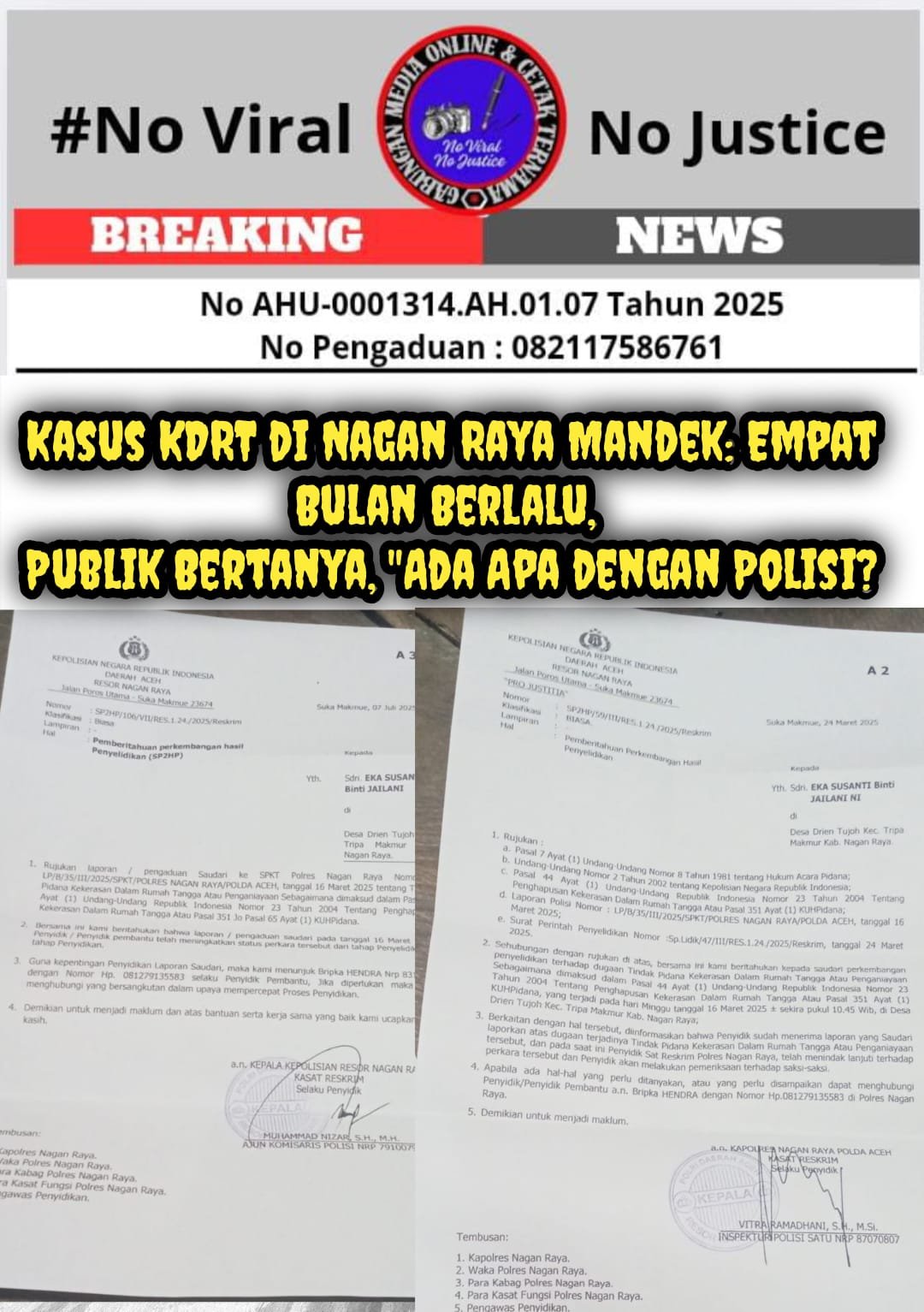 Masyarakat kini mendesak Polres Nagan Raya untuk membuka secara transparan alasan di balik keterlambatan proses penyidikan kasus KDRT ini. Jangan sampai hukum kembali dipandang tajam ke bawah, namun tumpul ke atas.