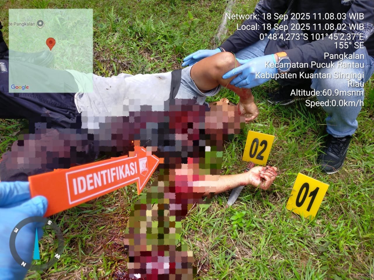 Mendapatkan laporan masyarakat, personel Polsek Kuantan Mudik yang dipimpin Kapolsek bersama Tim Identifikasi Polres Kuansing segera bergerak ke lokasi kejadian. Setibanya di TKP sekitar pukul 10.00 WIB, petugas langsung melakukan olah tempat kejadian perkara, memeriksa saksi-saksi, serta mengumpulkan bukti yang ada. Jenazah korban kemudian dibawa ke Rumah Sakit Bhayangkara Pekanbaru untuk dilakukan otopsi demi kepentingan penyelidikan lebih lanjut.