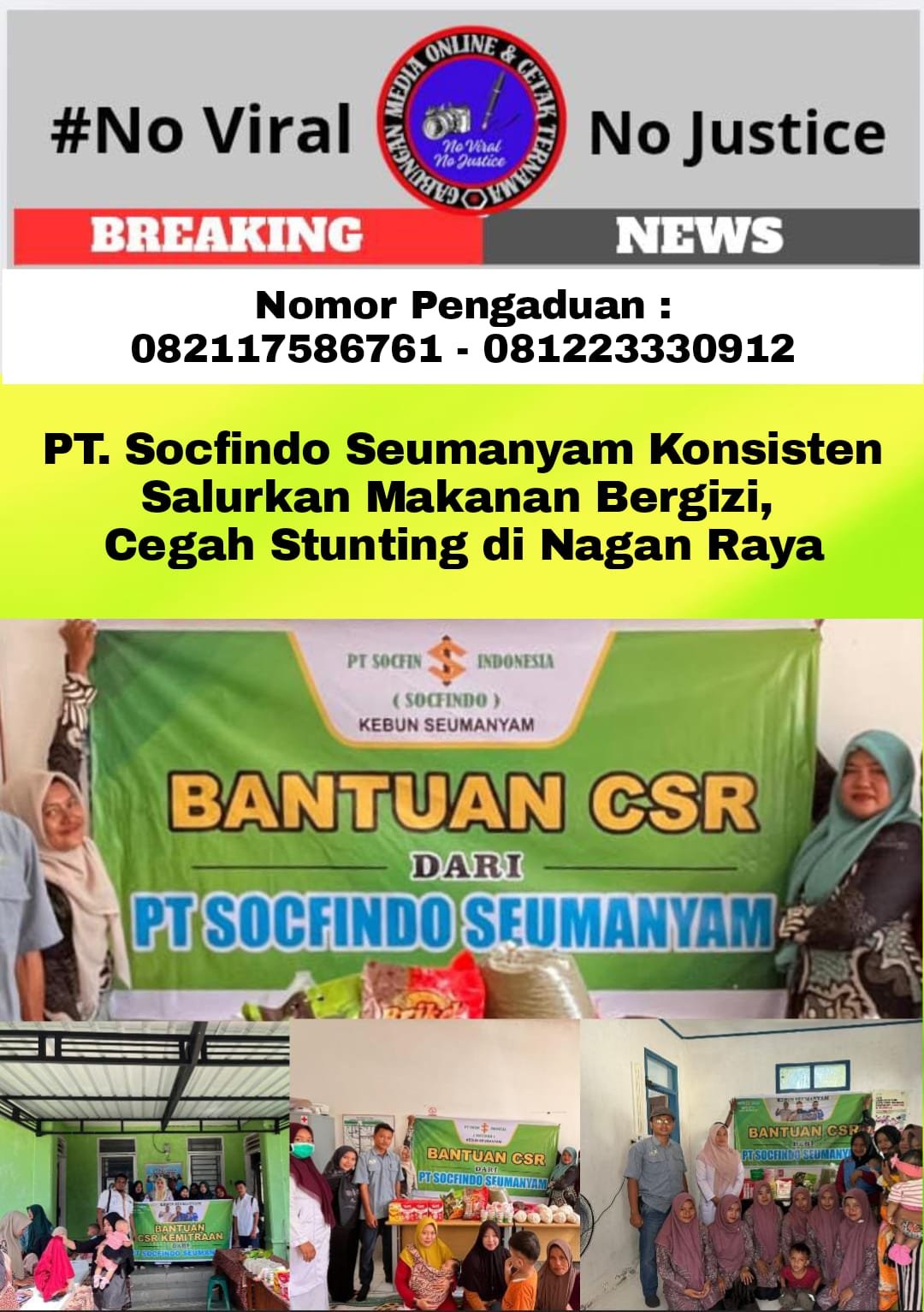 Bongkar Perkara.com Nagan Raya – PT. Socfindo Seumanyam kembali menunjukkan kepeduliannya terhadap kesehatan masyarakat dengan menyalurkan bantuan Pemberian Makanan Tambahan (PMT) bergizi bagi anak-anak di desa sekitar kebun. Program ini bertujuan mencegah stunting dan mendukung tumbuh kembang sehat generasi muda di Kabupaten Nagan Raya, Aceh.