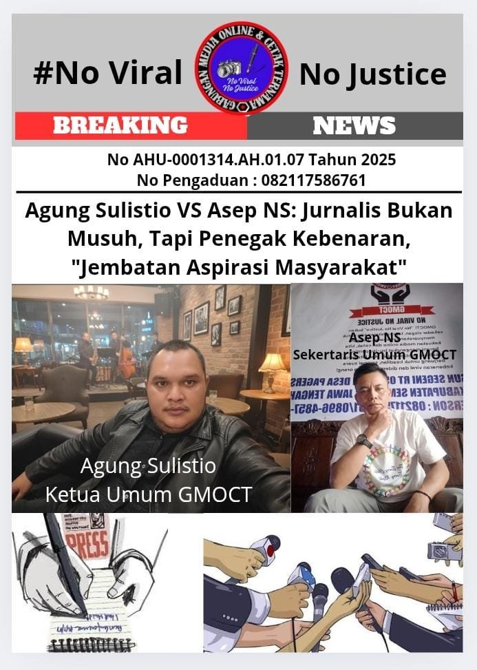 Jakarta, Bongkarperkara.com (GMOCT) — Pimpinan Redaksi Sahabat Bhayangkara Indonesia (SBI), Agung Sulistio, dalam kapasitasnya sebagai Ketua Umum Gabungan Media Online Cetak Ternama (GMOCT) dan Ketua II Dewan Pimpinan Pusat Lembaga Perlindungan Konsumen Republik Indonesia (LPK-RI), menegaskan bahwa jurnalis adalah penjaga kebenaran dan pilar demokrasi, bukan ancaman. Penegasan ini disampaikan di Jakarta, Sabtu (25/10).