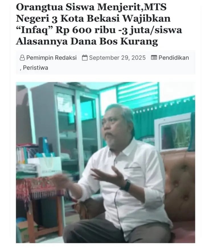 Pungli Di MTs Negeri 3 Kota Bekasi Mulai Tercium, polemik setelah pihak sekolah mewajibkan infaq mulai dari Rp600 ribu hingga Rp3 juta per siswa. Banyak orang tua merasa keberatan karena kebijakan ini ditetapkan tanpa musyawarah yang jelas, sementara kondisi ekonomi masyarakat berbeda-beda.