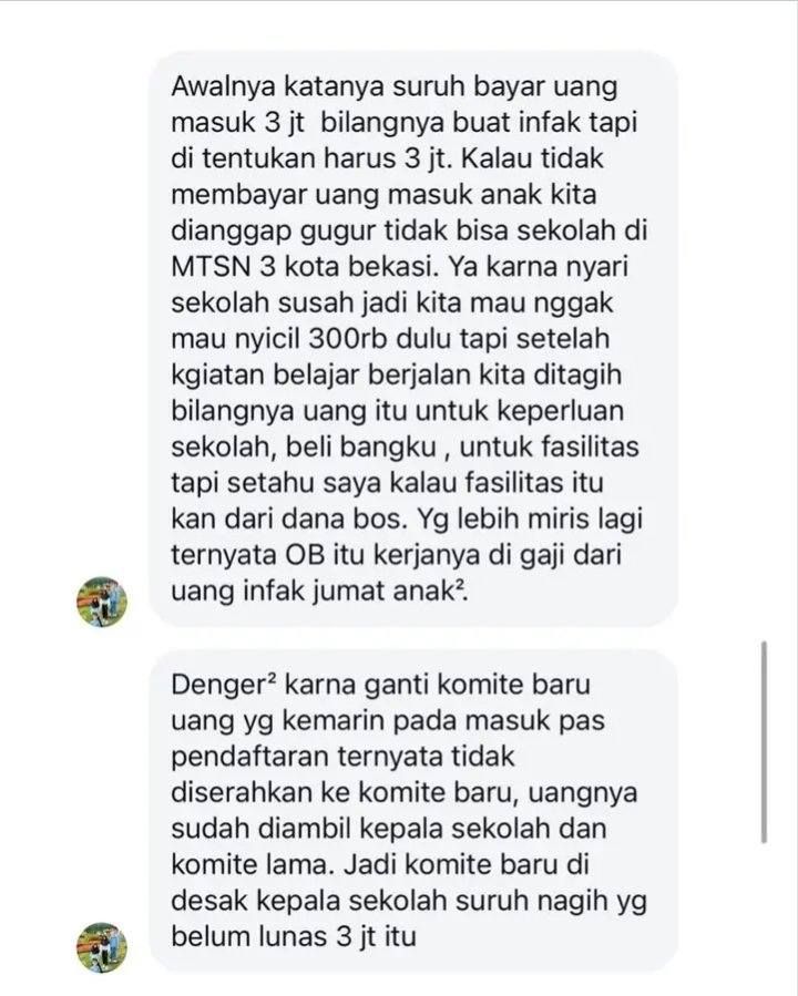 Dalam keluhan tersebut jelas Sudah seharusnya Walikota Bekasi Tri Adhianto bersikap tegas dan tidak pandang bulu,tidak mungkin komite melakukan hal tersebut bila mana Oknum di sekolah MTsn 3 Kota Bekasi mengarahkannya.
