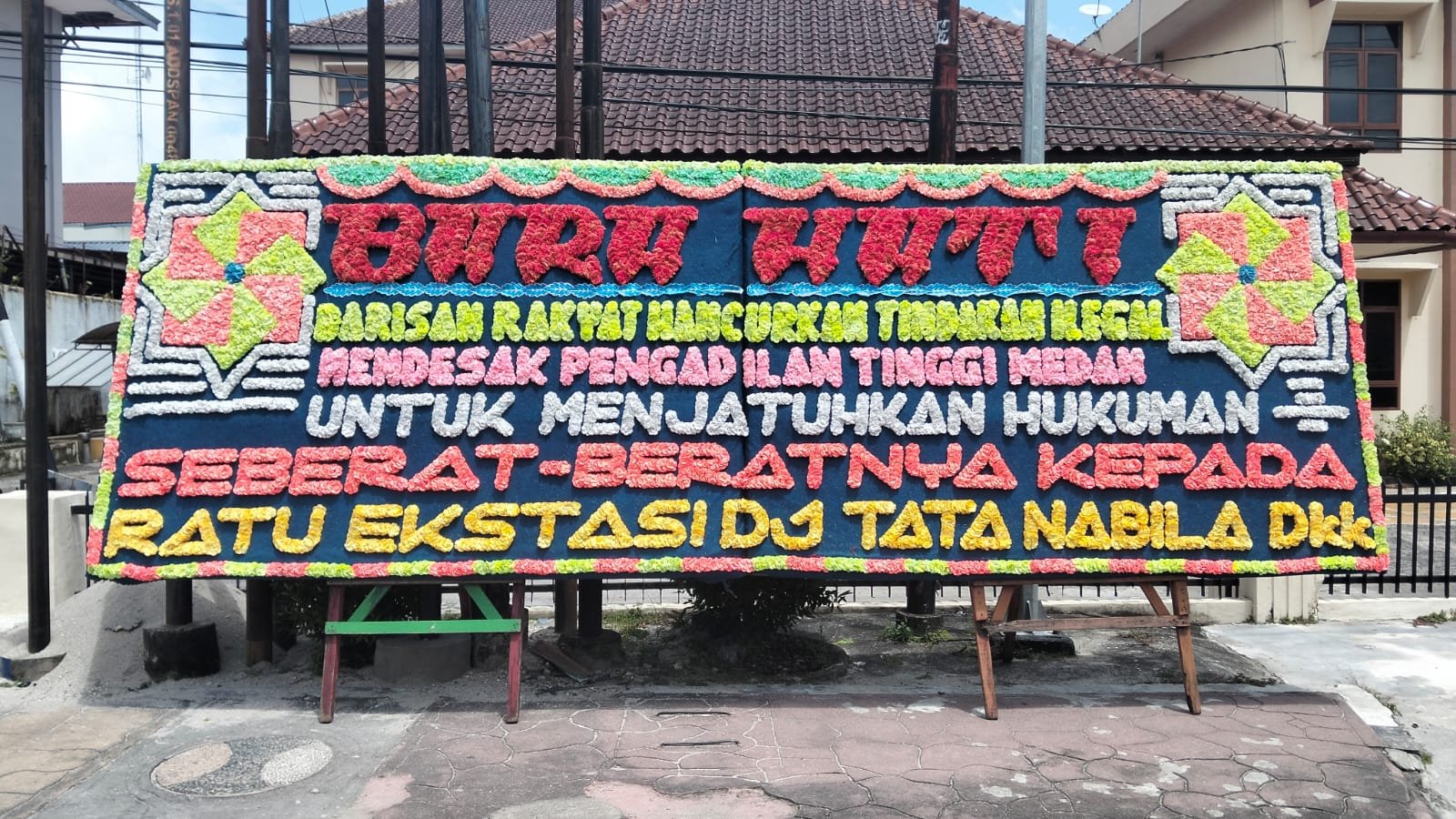 Sementara itu, papan bunga kedua dikirimkan langsung ke Pengadilan Negeri Pematangsiantar di Jalan Sudirman, berisi desakan keras kepada Pengadilan Tinggi Medan agar menjatuhkan hukuman maksimal terhadap para terdakwa dalam perkara narkotika tersebut. Tulisan di papan bunga itu berbunyi: