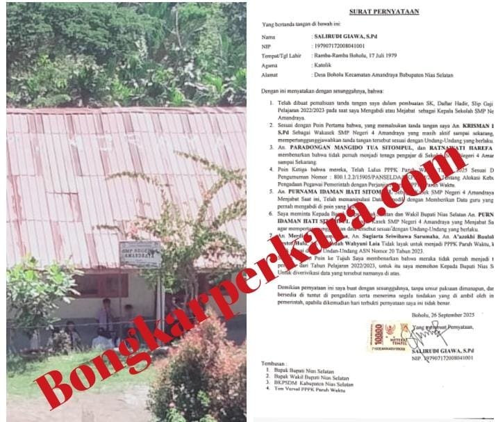 15 Oktober 2025 – Dunia pendidikan di Kabupaten Nias Selatan tengah diguncang isu serius setelah mantan Kepala Sekolah SMP Negeri 4 Amandraya, Salirudi Giawa, S.Pd, mengungkap dugaan pemalsuan tanda tangan, manipulasi data Dapodik, serta pengangkatan tenaga honorer yang tidak sah dalam proses seleksi PPPK Paruh Waktu Tahun 2025. Pengakuan mengejutkan itu disampaikan Salirudi melalui sebuah Surat Pernyataan resmi di atas materai yang ditandatangani pada tanggal 26 September 2025.