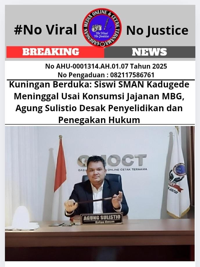 Bongkarperkara.com Kuningan (GMOCT) – Kabar duka menyelimuti dunia pendidikan di Kabupaten Kuningan. Novi, seorang siswi kelas 3 SMAN Kadugede, meninggal dunia setelah diduga mengalami keracunan akibat mengonsumsi jajanan MBG (nama jajanan disamarkan). Peristiwa tragis ini terjadi pada Kamis, 16 Oktober 2025, dan langsung memicu reaksi keras dari berbagai pihak.