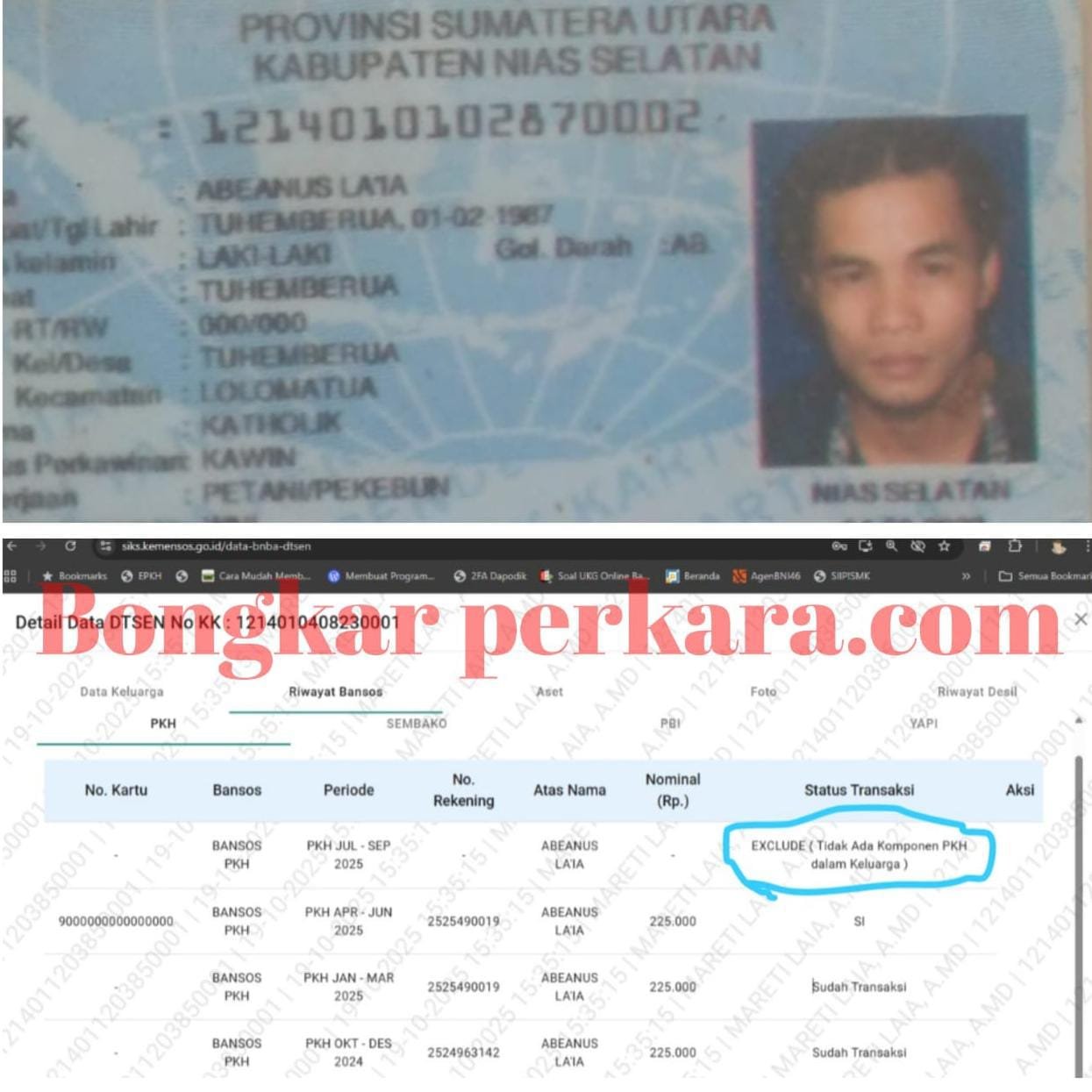 “Awalnya saat pembagian bansos di salah satu tempat di Kecamatan Lolomatua, banyak warga berkerumun. Setelah kami tanya, ternyata pencairan PKH. Saya menelepon salah satu pendamping PKH yang kami kenal dan bertanya apakah nama ibu saya ada dalam daftar penerima. Pendamping tersebut menjawab singkat melalui telepon seluler bahwa tidak ada,” ujar Abeanus Laia kepada wartawan pada 19 Oktober 2025.