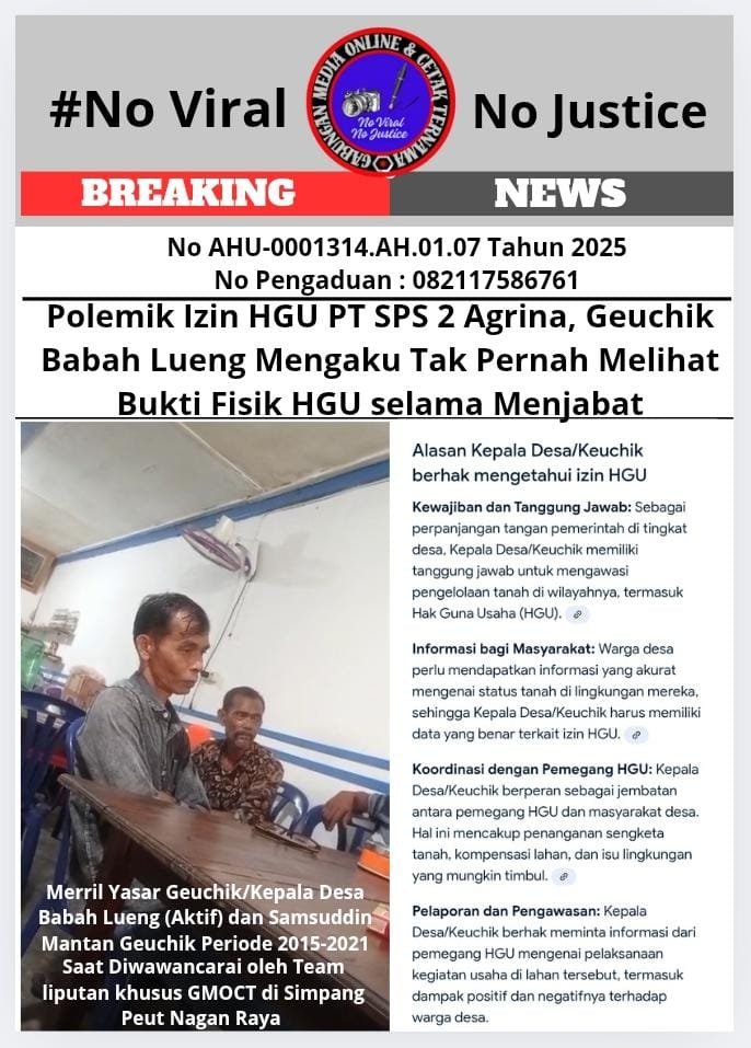 Bongkarperkara.com Nagan Raya, Aceh (GMOCT) – Polemik terkait izin Hak Guna Usaha (HGU) PT SPS 2 Agrina di Desa Babah Lueng, Kecamatan Tripa Makmur, Kabupaten Nagan Raya, Aceh, semakin mencuat. Dua Geuchik (Kepala Desa) Babah Lueng, baik yang masih aktif maupun mantan, menyatakan tidak pernah melihat bukti fisik izin HGU yang diklaim oleh perusahaan tersebut.