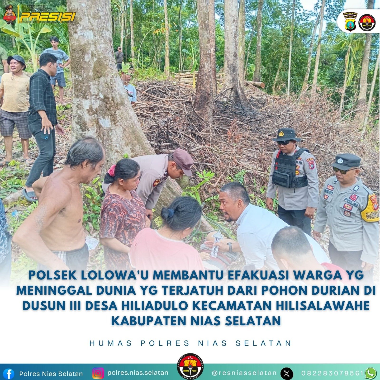 Polsek Lolowa’u Membantu Efakuasi Warga Yg Meninggal Dunia Yg Terjatuh Dari Pohon, Pada Rabu 01 Oktober 2025 , sekira Pukul 08.00 Wib, diterima informasi dari Warga Masyarakat Desa Hiliadulo bahwasanya ada seorang warga Desa Hiliadulo Kecamatan Hilisalawahe Kabupaten Nias Selatan yg meninggal dunia yg disebabkan oleh Terjatuh dari Pohon Durian.