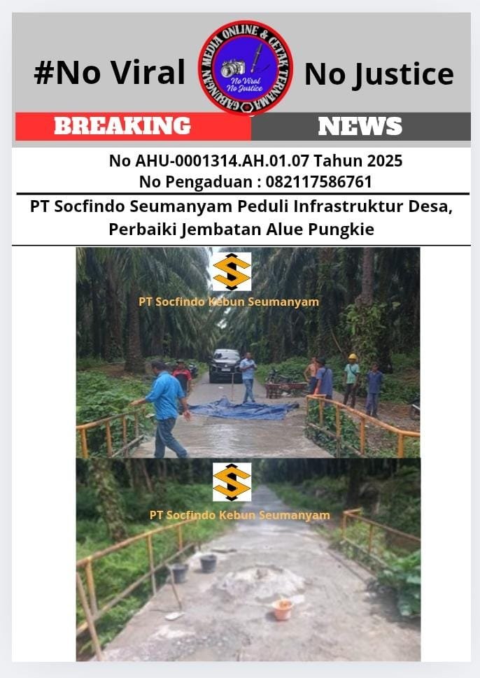 Bongkarperkara.com Nagan Raya, Aceh (GMOCT) — Sabtu, 11 Oktober 2025. PT Socfindo Seumanyam menunjukkan komitmennya terhadap masyarakat sekitar dengan memperbaiki jembatan lintas Desa Alue Pungkie (Gunong Kong), Kecamatan Darul Makmur, Kabupaten Nagan Raya. Perbaikan ini merupakan wujud tanggung jawab sosial perusahaan (CSR) yang berkelanjutan.