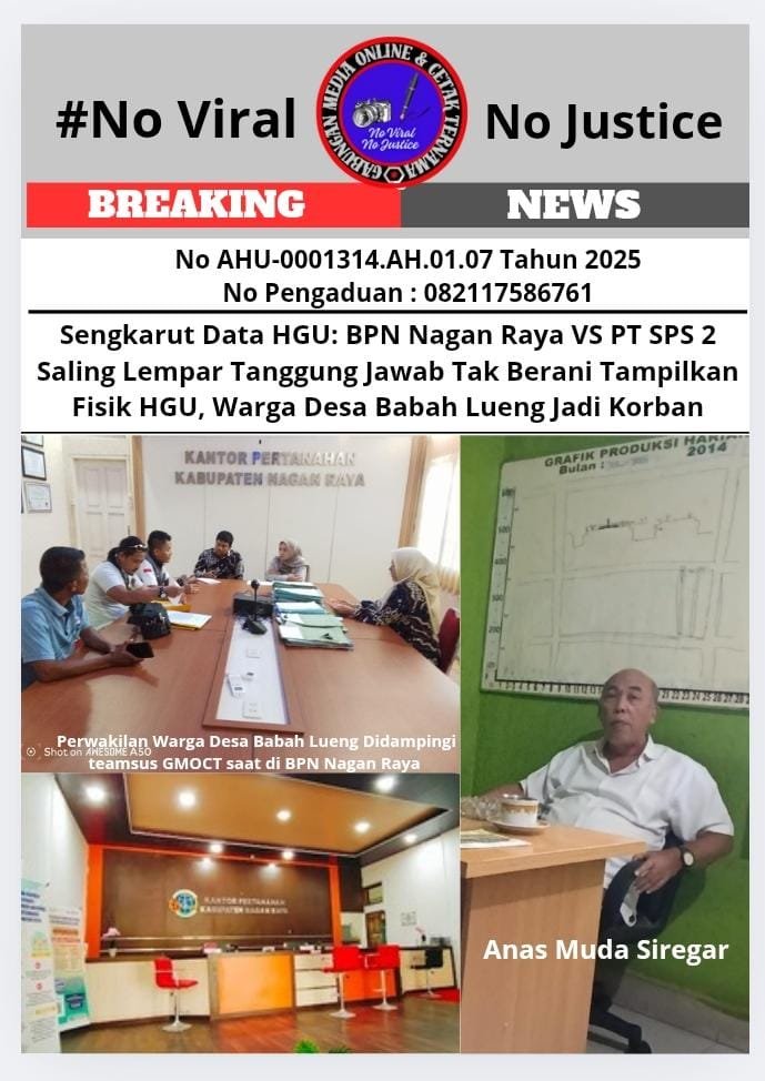 Bongkar perkara.com Nagan Raya, Aceh (GMOCT) 12 Oktober 2025 – Polemik terkait keterbukaan informasi Hak Guna Usaha (HGU) kembali mencuat di Nagan Raya, Aceh, setelah PT SPS 2 Agrina dan Badan Pertanahan Nasional (BPN) setempat terlibat saling lempar tanggung jawab untuk memperlihatkan bukti fisik ijin HGU yang diklaim oleh PT SPS 2 Agrina untuk dijadikan dasar melaporkan dua warga Desa Babah Lueng. Konflik ini berdampak langsung pada warga Desa Babah Lueng yang kini terancam kriminalisasi.
