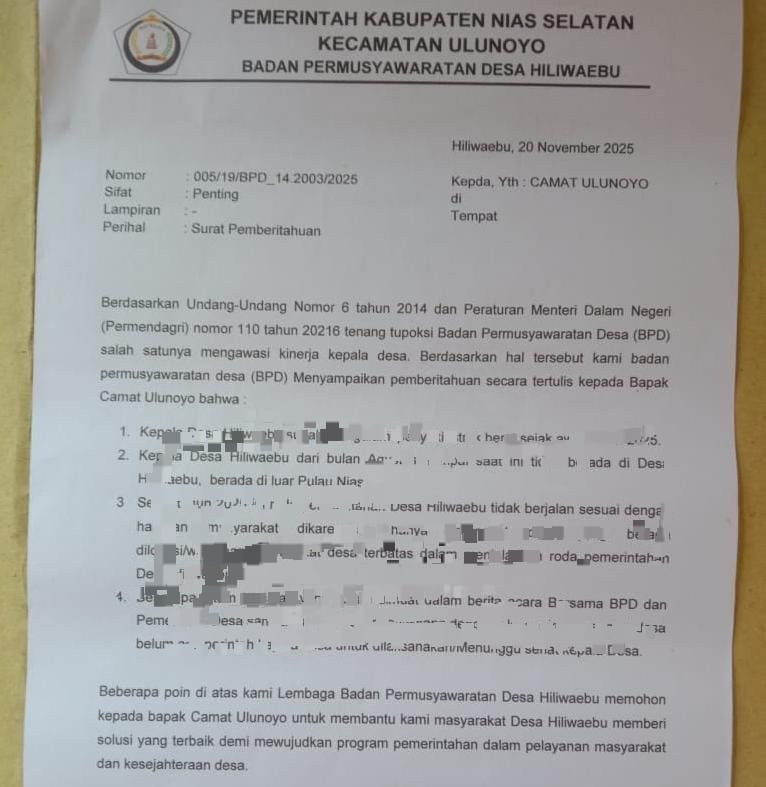 Situasi pemerintahan di Desa Hiliwaebu Ulunoyo kini memasuki titik kritis. Badan Permusyawaratan Desa (BPD) bersama perwakilan masyarakat akhirnya mengambil langkah ekstrem dengan melayangkan surat resmi kepada Camat Ulunoyo. Langkah ini diambil karena desa selama berbulan-bulan berjalan tanpa arah akibat Kepala Desa yang hilang entah ke mana. Surat tersebut dikirim pada Jumat, 21 November 2025, sebagai bentuk peringatan keras bahwa masyarakat sudah tidak bisa lagi menanggung ketidakpastian.