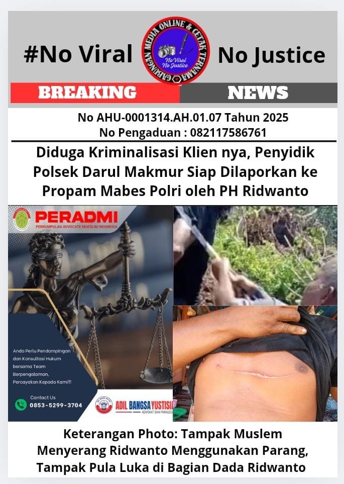 Bongkarperkara.com Nagan Raya (GMOCT) – Penasehat hukum Ridwanto, yang merasa kliennya menjadi korban kriminalisasi, akan melaporkan penyidik Polsek Darul Makmur ke Biro Wasidik dan Propam Mabes Polri. Langkah ini diambil menyusul penetapan Ridwanto sebagai tersangka dalam kasus dugaan penganiayaan, yang dinilai janggal dan penuh kejanggalan.