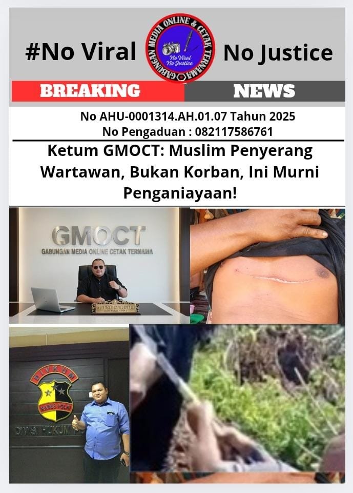 Bongkarperkara.com Jakarta, 31 Oktober 2025 (GMOCT) — Ketua Umum Gabungan Media Online dan Cetak Ternama (GMOCT), Agung Sulistio, memberikan tanggapan keras atas pernyataan kuasa hukum Muslem, pelaku pembacokan terhadap Ridwanto, Ketua DPD GMOCT Provinsi Aceh. Agung menegaskan bahwa fakta hukum menunjukkan Muslem adalah penyerang, bukan korban, dan tindakan tersebut murni penganiayaan.