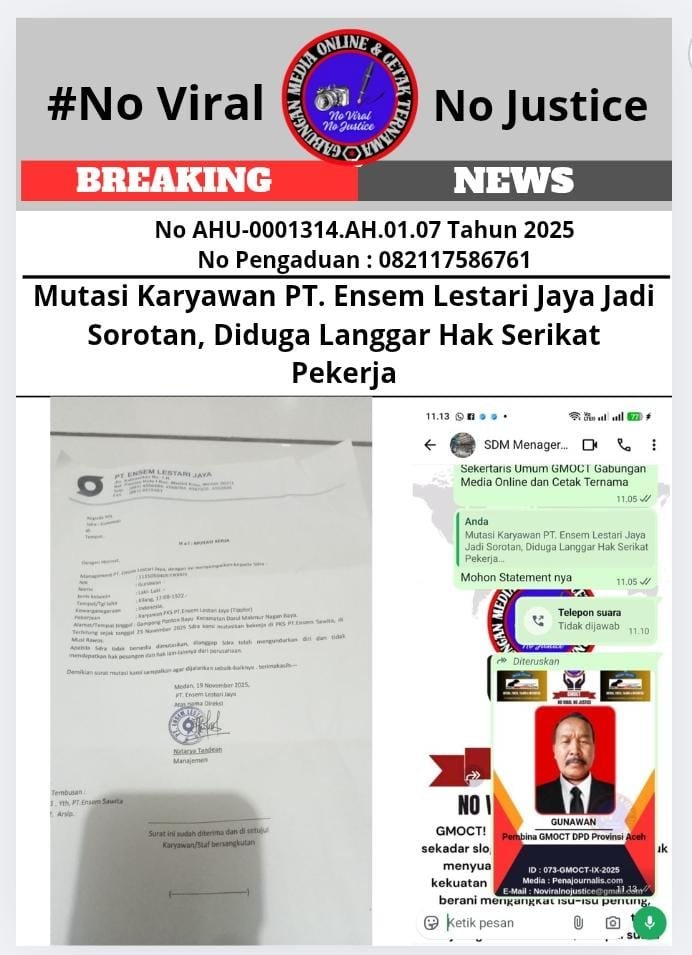 Medan Bongkarperkara.com (GMOCT) – Surat mutasi kerja yang dikeluarkan oleh PT. Ensem Lestari Jaya tertanggal 19 November 2025, atas nama Gunawan, seorang karyawan yang juga menjabat sebagai pengurus serikat pekerja, menuai sorotan. Mutasi tersebut dinilai tidak sesuai dengan ketentuan perundang-undangan yang melindungi hak-hak pengurus serikat pekerja.