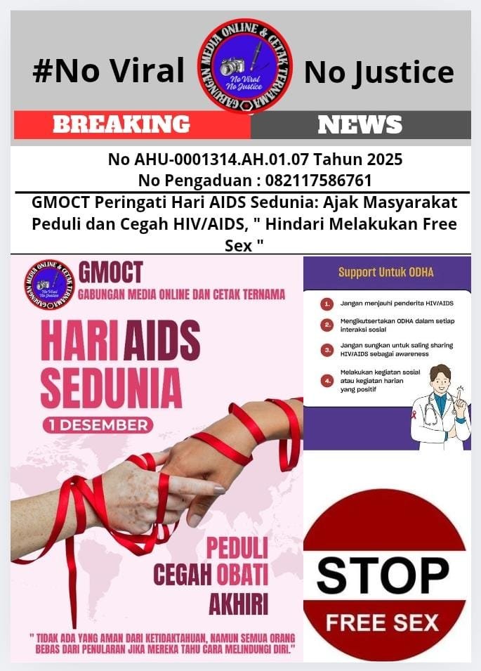 Bongkarperkara.com Kabupaten Semarang, 1 Desember 2025 – Gabungan Media Online dan Cetak Ternama (GMOCT) dalam rangka memperingati Hari AIDS Sedunia yang jatuh pada tanggal 1 Desember. Melalui Platform Media Online dan Cetak yang tergabung di GMOCT memberikan penayangan edukasi yang bertujuan untuk meningkatkan kesadaran masyarakat tentang bahaya HIV/AIDS, serta mengajak untuk peduli, melakukan pencegahan, dan memberikan dukungan kepada orang dengan HIV/AIDS (ODHA).