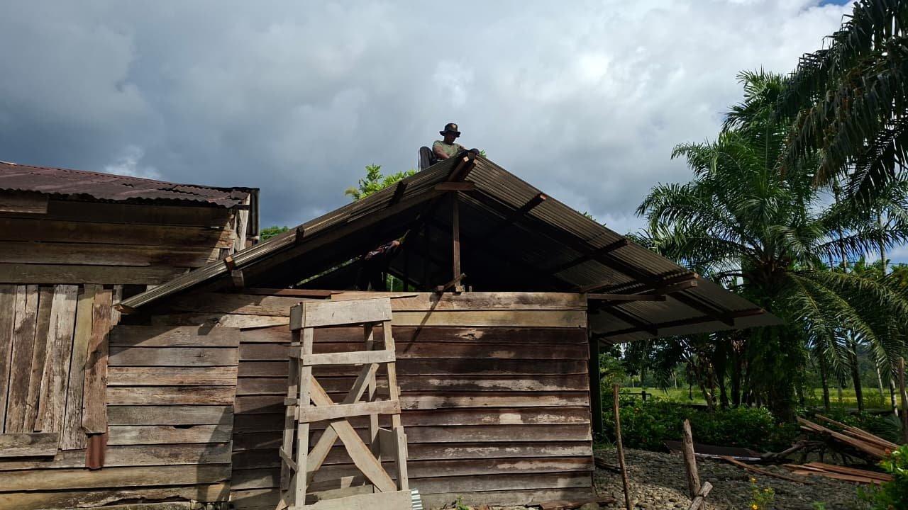 Proses penggantian atap dilakukan secara hati-hati dengan mengganti bagian yang telah lapuk menggunakan material baru yang lebih kuat dan tahan lama. Pengerjaan tersebut juga melibatkan semangat gotong royong antara personel Satgas TMMD dan masyarakat setempat.