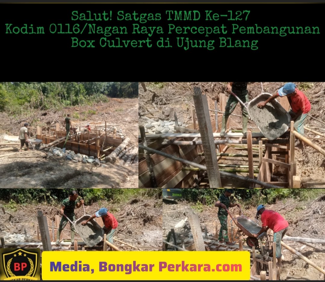 NAGAN RAYA – Bongkar perkara.com Program TNI Manunggal Membangun Desa (TMMD) ke-127 yang dilaksanakan Kodim 0116/Nagan Raya terus menunjukkan progres signifikan. Salah satu sasaran fisik yang kini dipercepat pengerjaannya adalah pembangunan box culvert di Desa Ujung Blang, Kecamatan Beutong, Kabupaten Nagan Raya, Minggu (22/2/2025).