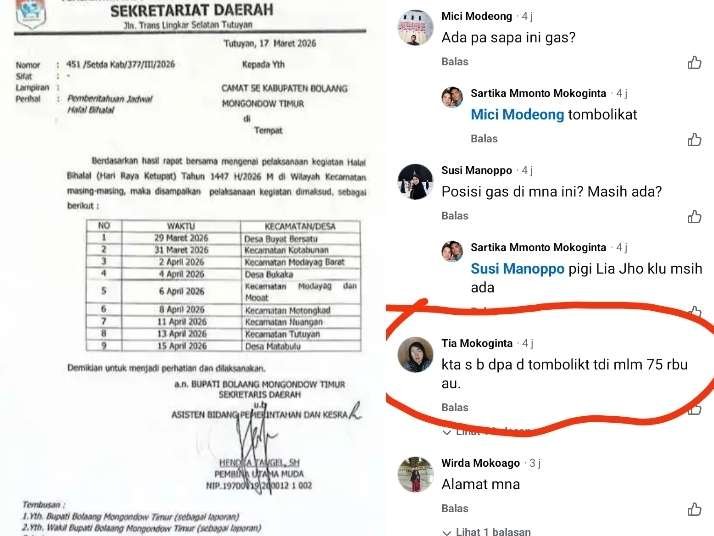 BOLAANG MONGONDOW TIMUR — Di tengah kelangkaan dan lonjakan harga LPG 3 kilogram yang terjadi sejak awal bulan Ramadan, masyarakat di Kabupaten Bolaang Mongondow Timur (Boltim) justru dihadapkan pada beredarnya surat resmi pemerintah daerah terkait jadwal pelaksanaan kegiatan Halal Bihalal.