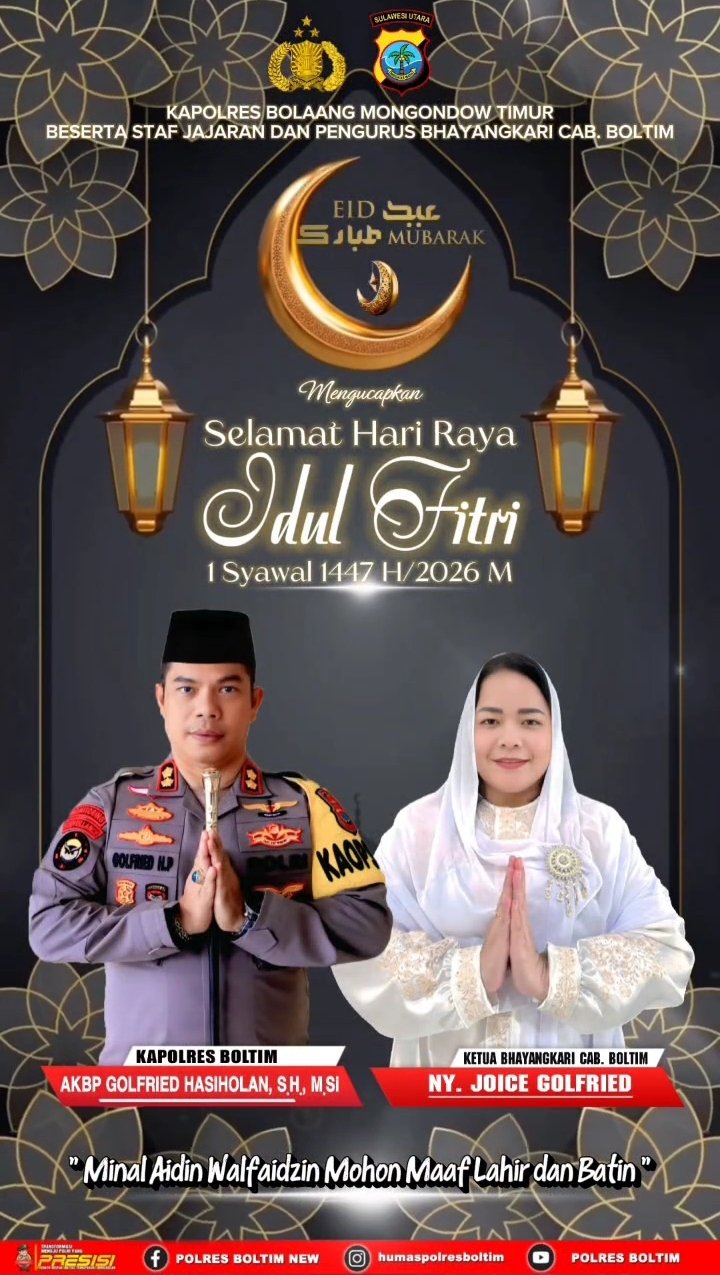 BOLTIM — Dalam rangka menyambut Hari Raya Idul Fitri 1 Syawal 1447 Hijriah atau tahun 2026 Masehi, Kapolres Bolaang Mongondow Timur (Boltim) AKBP Golfried Hasiholan, S.H., M.Si bersama Ketua Bhayangkari Cabang Boltim, Ny. Joice Golfried, menyampaikan ucapan selamat kepada seluruh masyarakat.