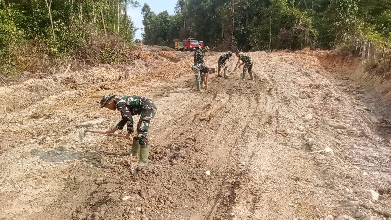 Di lapangan, prajurit terlihat bergotong royong meratakan tanah, memperbaiki jalur yang rusak, serta memastikan kendaraan pengangkut material dapat bekerja tanpa hambatan.