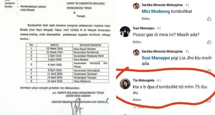 Di Tengah Kelangkaan LPG dan Harga Tembus Rp75 Ribu, Pemda Boltim Edarkan Jadwal Halal Bihalal Berita, Boltim, Daerah|Senin, 23 Maret 2026oleh Redaksi Timor BOLAANG MONGONDOW TIMUR — Di tengah kelangkaan dan lonjakan harga LPG 3